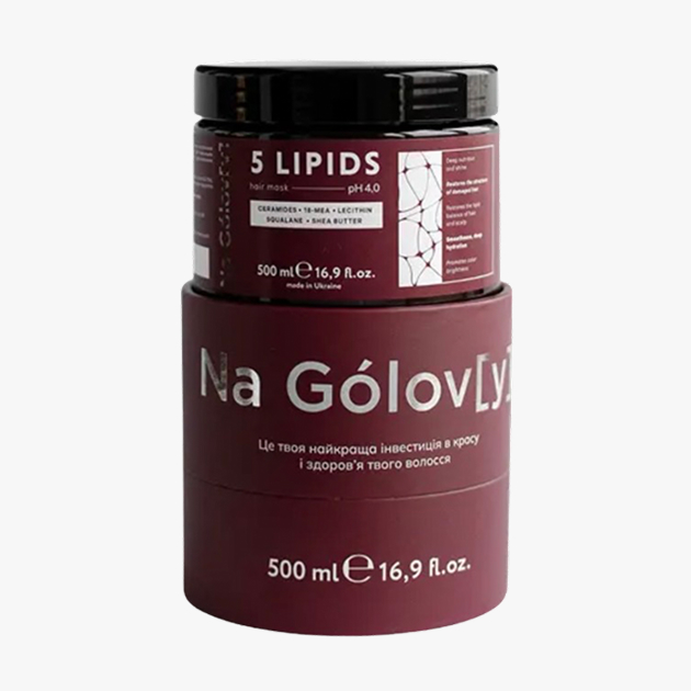 Маска для волосся 5 ліпідів ТМ «Na Golov[y]» призначена для глибокого живлення та блиску пошкодженого, сухого волосся. Вона ефективно кондиціонує і розгладжує, глибоко зволожує, відновлює гідроліпідний баланс шкіри голови та волосся, сприяє яскравості кольору